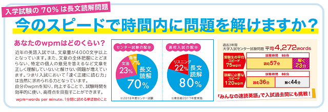 英語は入試の主要科目。その中でも長文は配点が大きく、また試験時間の配分も大きくなります。長文読解は英語の様々な力が総合的に影響しています。